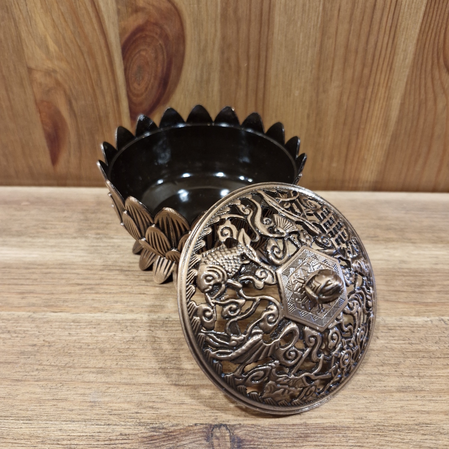 Dieses Räuchergefäß für Kräutermischungen aus Messing ist einer buddhistischen Lotus Blüte nachempfunden. Der Deckel des Gefäßes ist abnehmbar um das Räuchergefäß mit Sand, Kohle, Weihrauch oder einer Räuchermischung zu befüllen.