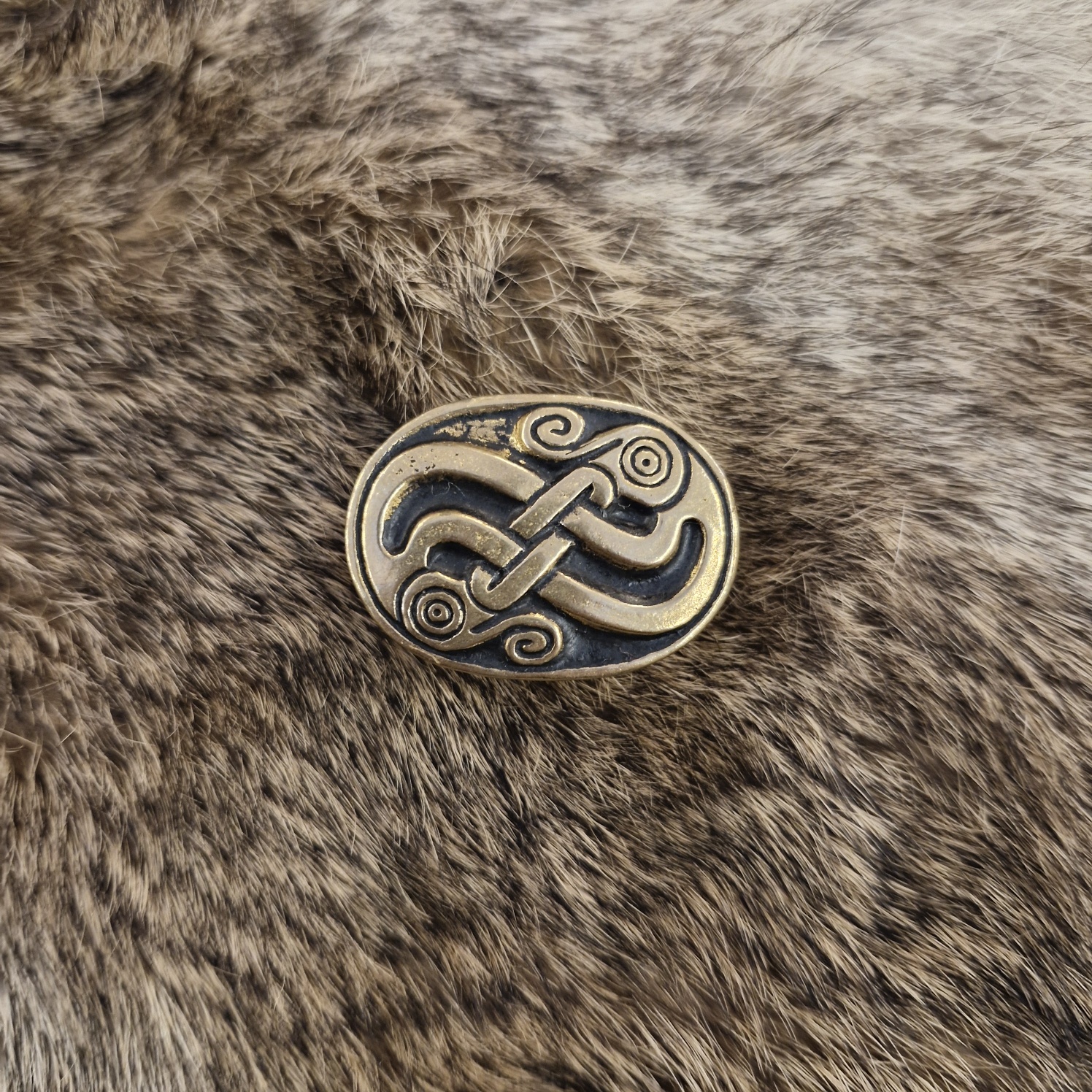 Dieser ovale Frühmittelalter Griffabschluss Vendel ist perfekt für den DIY Messerbau eines Sax oder Arbeitsmesser und wurde aus hochwertiger Bronze gefertigt, die auf Wunsch auch versilbert wird. Dieser vendelzeitliche Griffabschluss zeigt zwei sich spiegelnde Schlangenwesen, die auf den Fund einer Brosche aus der Vendelzeit, der weniger bekannten Epoche vor der Wikingerzeit. Auf der Rückseite hat des Frühmittelalter Griffabschluss befinden sich zwei 1 mm starke Stifte von ca. 1,5 cm Länge, die Du in den Messergriff einlassen musst, damit sich des Endstück sicher mit dem Griff verbindet. Dazu empfehlen wir zusätzlich der Einsatz eines Zwei-Komponenten-Klebers. Eine mögliche Zwischenlage aus Leder, Horn oder Fiber ist dann nochmal eine zusätzliche schöne optische Spielerei. Mit diesen Frühmittelalter Griffabschluss Vendel hast du einen perfekten Abschluss und Blickfang für Dein individuelles selbst gefertigtes frühmittelalterliches Arbeitsmesser oder Sax.
