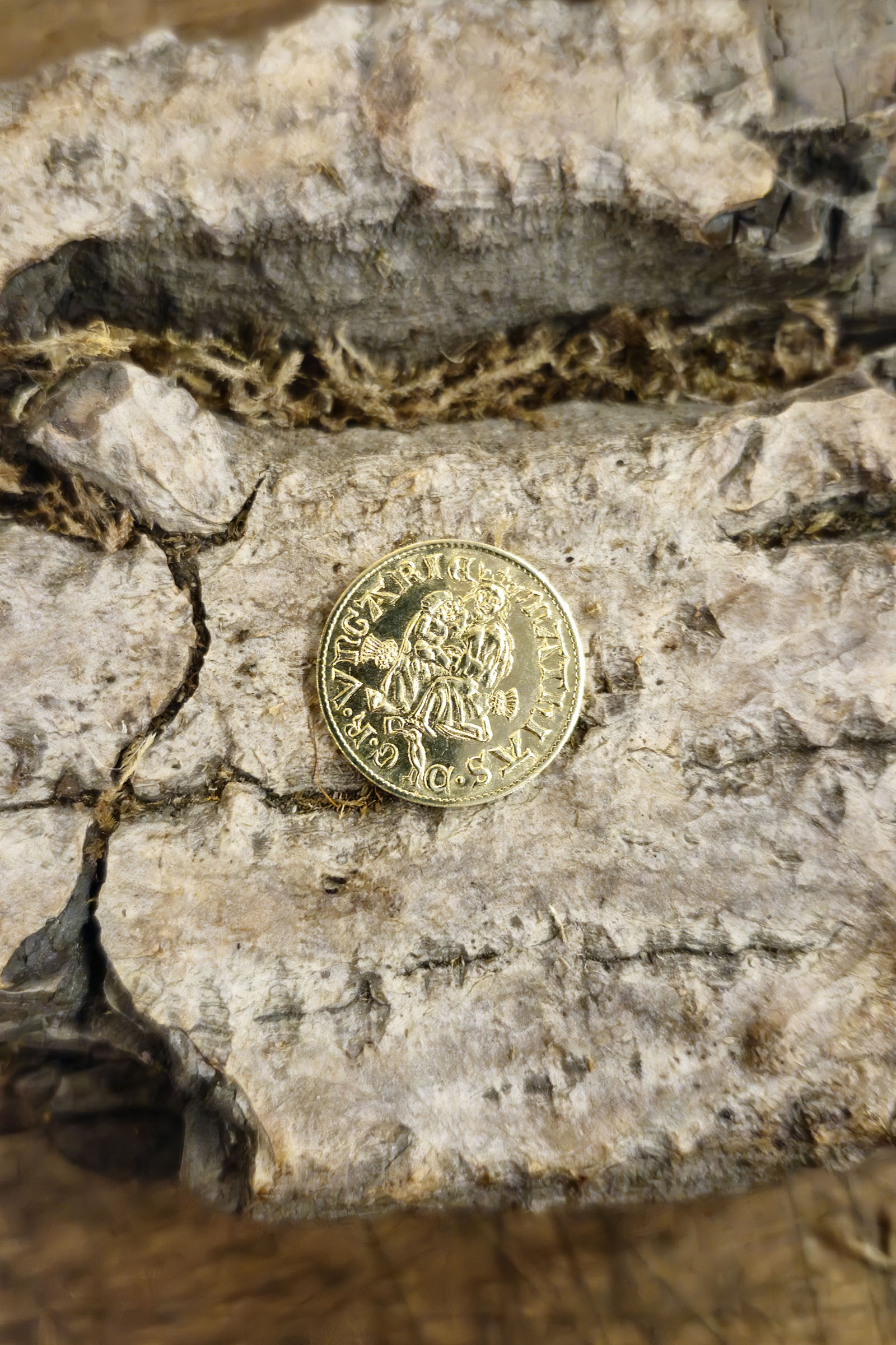 Eine Geschichte von Macht und Legende. Dieses Replik einer ungarischen Golddukaten Münze wurde nach mittelalterlicher Technik mit einem handgravierten Stempel geprägt und besticht durch seine Detailtreue. Als Material wurde Messing gewählt und nach der Prägung poliert um sehr nah an die Original Goldoptik zu bekommen.Auf der Vorderseite sitzt die gekrönte Madonna auf dem Thron, darunter fliegt ein Rabe mit Ring – das Wappen der Familie Hunyadi, verbunden mit Matthias Corvinus. Die Rückseite zeigt Heiligen Ladislaus in Rüstung mit Streitbeil und Reichsapfel, den Schutzpatronen Ungarns.