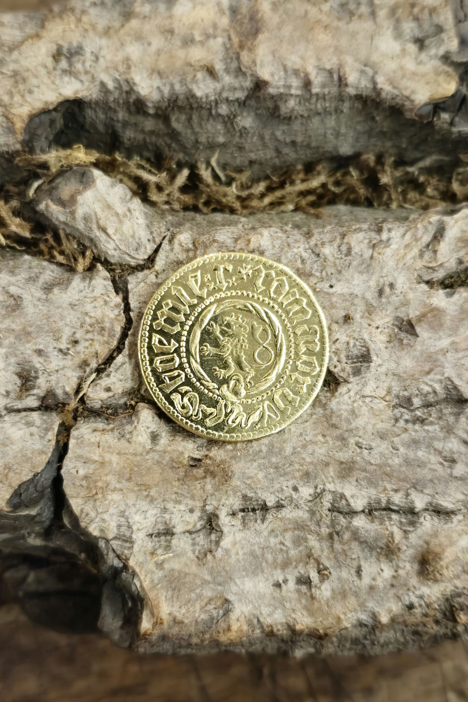 Dieses Replik des Golddukat Wenzels IV. wurde nach mittelalterlicher Technik wie in den königlichen Münzstätten mit einem handgravierten Stempel geprägt, besticht durch seine hohe Detailtreue und historische Genauigkeit. Als Material wurde Messing gewählt und nach der Prägung poliert um sehr nah an die Original Goldoptik zu bekommen. Auf der Vorderseite befindet sich mittig ein großes gotisches Monogramm „W“ (Wenceslaus), König Wenzel, eingerahmt von Namens- und Titellaufschrift. Die Rückseite zeigt das traditionelle Symbol des böhmischen Königreichs – den gekrönten, doppelschwänzigen Löwen im Sprung, umgeben von Zierelementen und einer Inschrift.