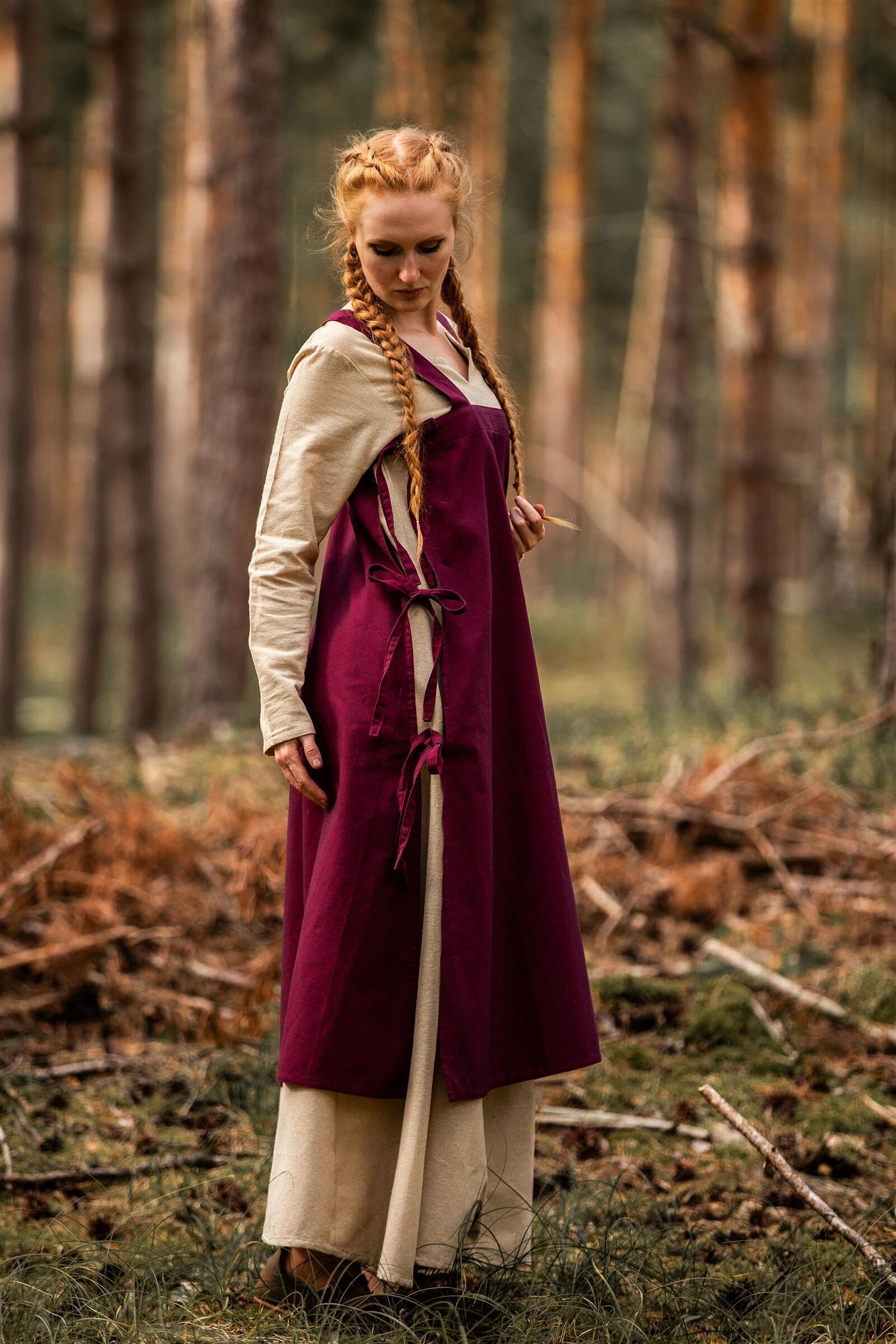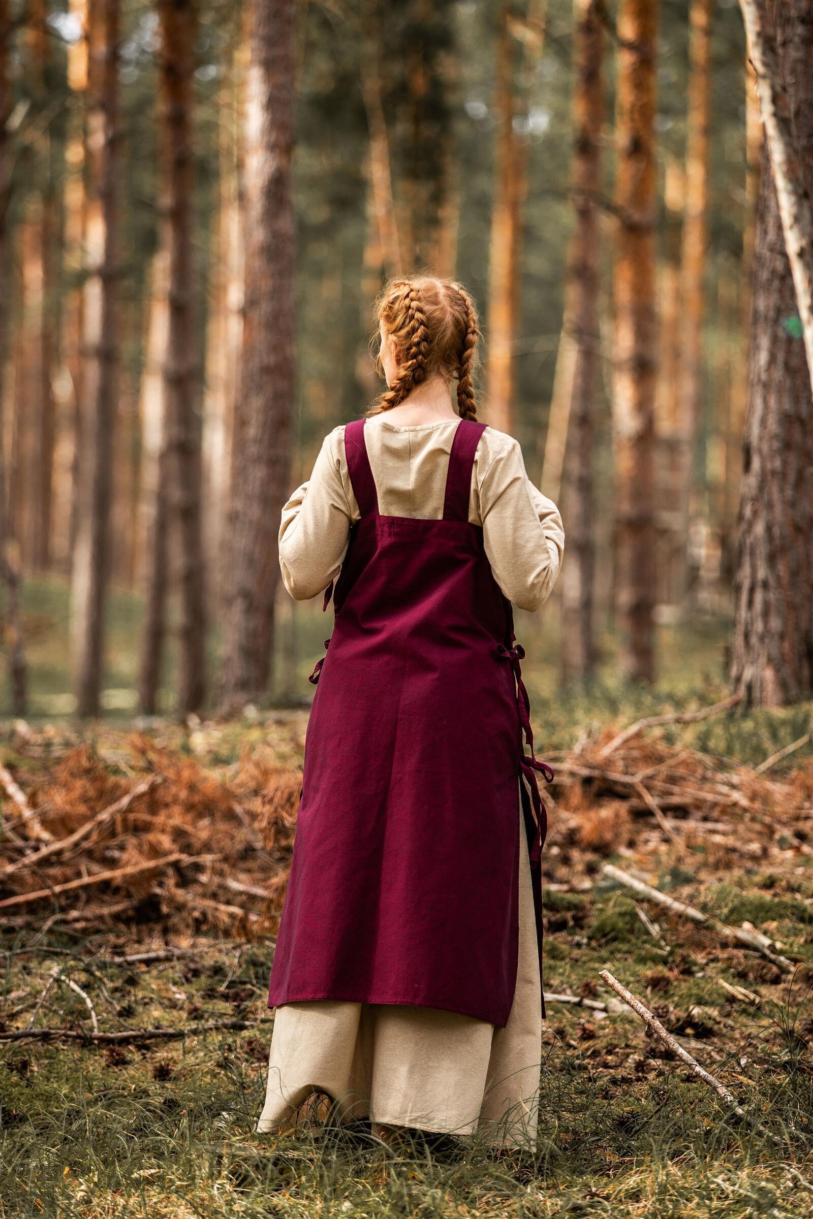 Unser LARP Überkleid ist ein sogenanntes Schürzenkleid und dient bei Arbeiten als verlängerte Schürze. Es wurde in Handarbeit gefertigt, besitzt breite Träger und ist an den Seiten offen. Mit Hilfe drei seitlicher Schnürungen lässt es sich perfekt an den Körper anpassen und über fast jedem Unterkleid kombinieren. Dieses LARP Überkleid ist genau die richtige Gewandung für viele nordische LARP Charaktere und den Mittelaltermarkt.