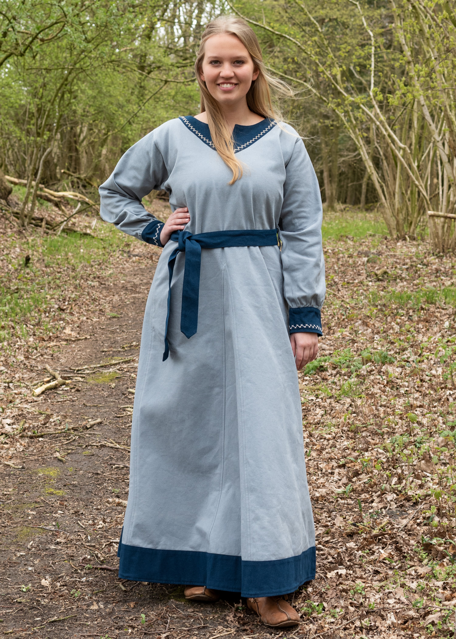 Dieses bodenlange Frühmittelalter Kleid mit Stickerein wurde aus robuster Baumwolle gefertigt und besitzt einen lockeren Schnitt. Besonders auffällig sind dabei die farblich abgesetzen Stickereien die das gesamte Frühmittelalter Kleid aufwerten. Der geschlitzte Ausschnitt vorne kann offen getragen oder mit einer Fibel verschlossen werden. Für die Taille kann der mitgelieferte Stoffgürtel verwendet werden, ein Ledergürtel wäre aber auch passend. Typisch für diese frühmittelalterlichen Kleider sind die Schnitte, die sich überwiegend aus Rechtecken und Dreiecken zusammengesetzten, um so möglichst wenig Stoff zu verbrauchen. Und so ist dieses Kleid perfekt für Frühmittelalter Darstellung von Wikinger, Franken, Friesen, Mercier und vielen mehr, es eigent sich für den Mittelaltermarkt, einen Ritteressen und auch LARP.