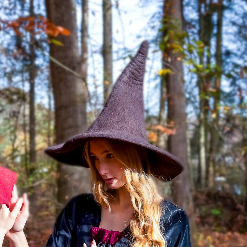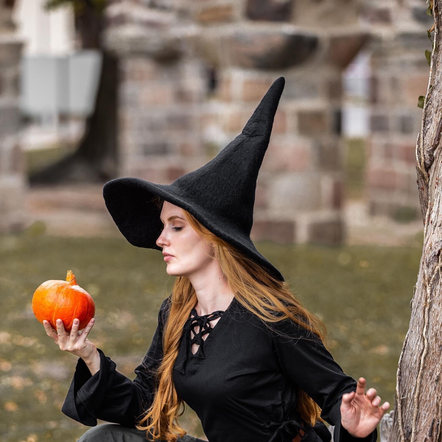 Diese ikonische Kopfbedeckung die im Mittelalter und LARP oft als Hexenhut bezeichnet wird, wurde aus weichen Wollfilz in Handarbeit hergestellt. Der Hexenhut besitzt eine breite Krempe, läuft spitz nach oben zu und endet mit einer eingerollten Spitze. Mit dem Mittelalter & LARP Hexenhut bist du nicht zu übersehen und machst auf dem Mittelaltermarkt, bei Halloween, Fasching oder LARP eine gute Figur.