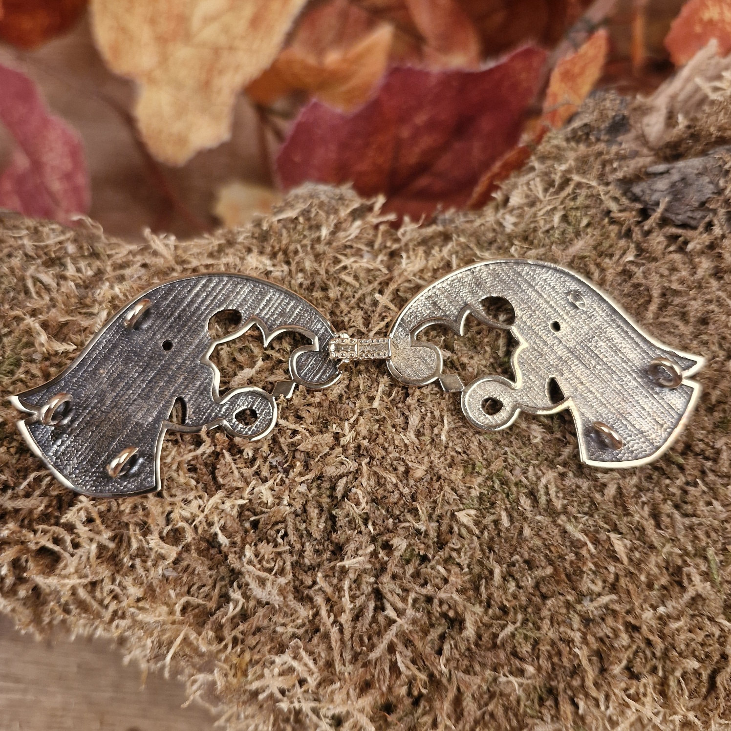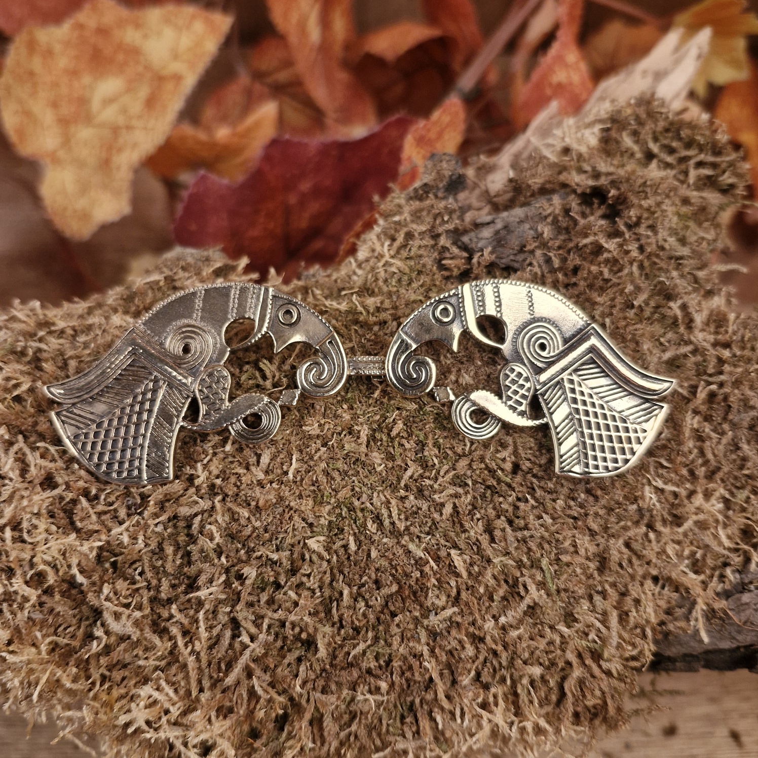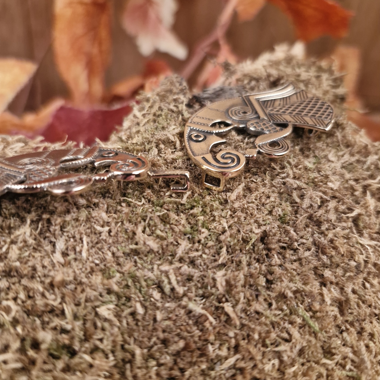 Dieses Bronze Gewandschließe Vendel Raben ist sehr detailliert und zeigen die beiden Raben des germanischen Gottes Wotan. Das historische Original wurden auf der Insel Gotland in Schweden gefunden und stammt aus der Zeit um 550. Diese vorwikingerzeitliche Epoche nennt man die Vendelzeit und daher leitet sich auch die Bezeichnung der Namen der Raben ab. Die beiden Raben werden über einen Haken und eine Öse miteinander als Verschluss verbunden und eignen sich perfekt als Geschenk und Accessoires im LARP, auf den Mittelaltermarkt, zum Cosplay und für die Frühmittelalter Darstellung.