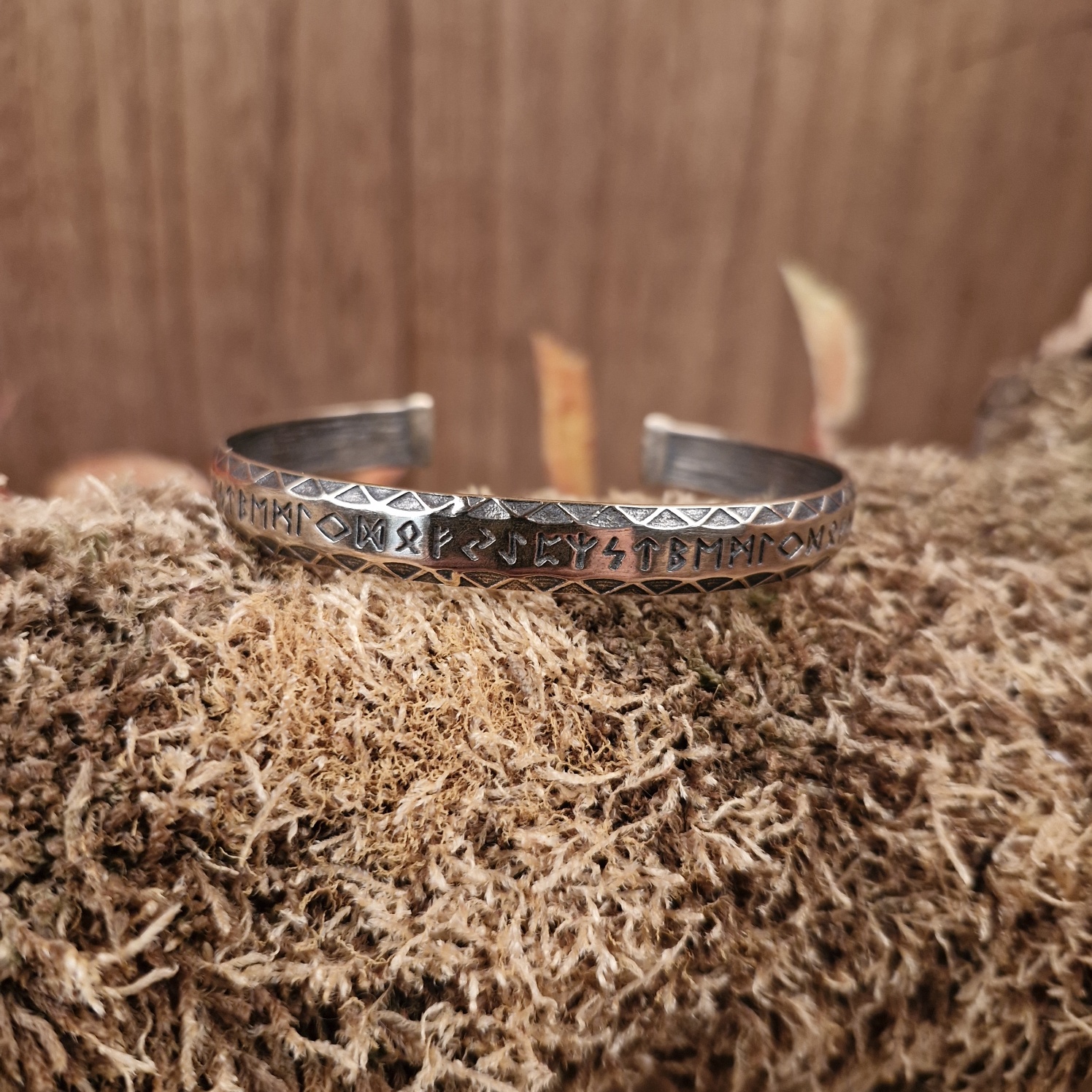 Dieser handgefertigte LARP Armreif mit Runen aus robuster Bronze wurde mit Runen aus dem Alten Futhark verziert und ist ideal für nordische Charaktere im LARP. Der Armreif mit Runen ist auf der Rückseite offen lässt sich vorsichtig anpassen. Der LARP Armreif mit Runen aus Bronze ist ideal für den Mittelaltermarkt, Cosplay und LARP.