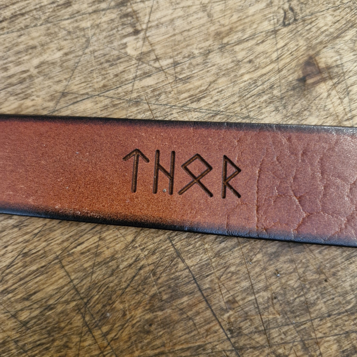 Dieses Wikinger Lederarmband mit Runeninschrift mit Runeninschrift wurde aus hochwertigem und strapazierfähigem Leder gefertigt, das angenehm zu tragen ist und mit der Zeit an Charakter gewinnt. Das Lederarmband ist mit verschiedenen Runen verziert, die aus der wikingerzeitlichen Runenfurthark bestehen und nicht nur eine symbolische Bedeutung haben. Wir haben aktuell die Varianten Freya, Thor, Odin und da es aus einen englischsprachigen Handwerk stammt The Norsemen, also Nordmänner als Runeninschrift und damit einen Verbindung zu den Wikingergötter und ihrem Volk. Geschlossen wir das Runenarmband mittels eines Beiltaschenknopf und drei Löcher mit dem Du noch die Größe einstellen kannst. Das besondere Design und die hochwertigen Verarbeitung machen das Wikinger Lederarmband mit Runeninschrift perfekt für jeden Wikinger & Vikings Fan im Alltag, aber auch als Geschenk für einen Freund, Sippen- oder ein Familienmitglied.