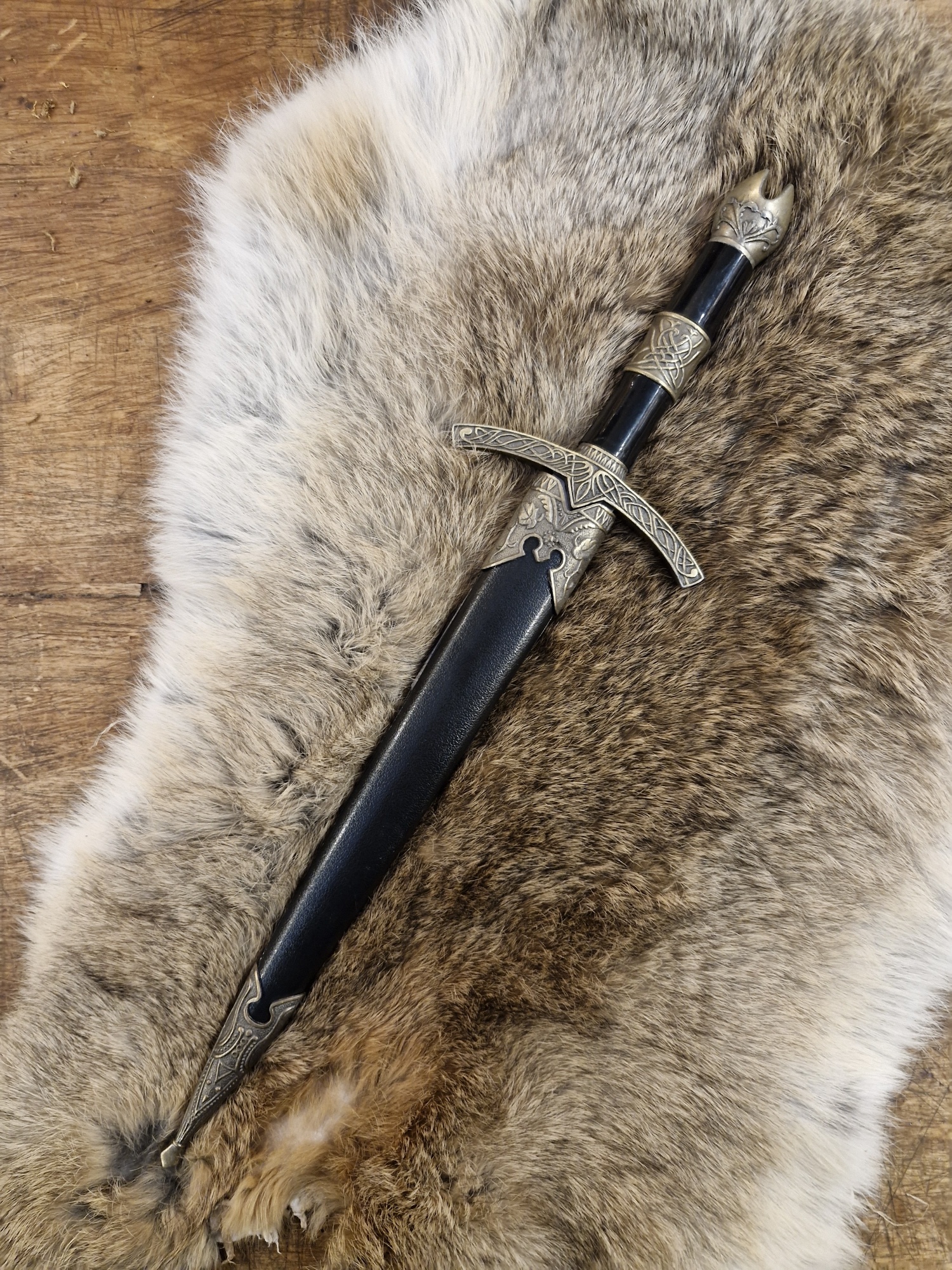 Der Deko Dolch Mittelalter wurde aus rostfreien Stahl gefertigt und besitzt ein leicht gebogenes Parier inklusive einer verzierten Dolchscheide und einen hufähnichen Knauf. Eine passende Dekoration für Mittelalter Fans.