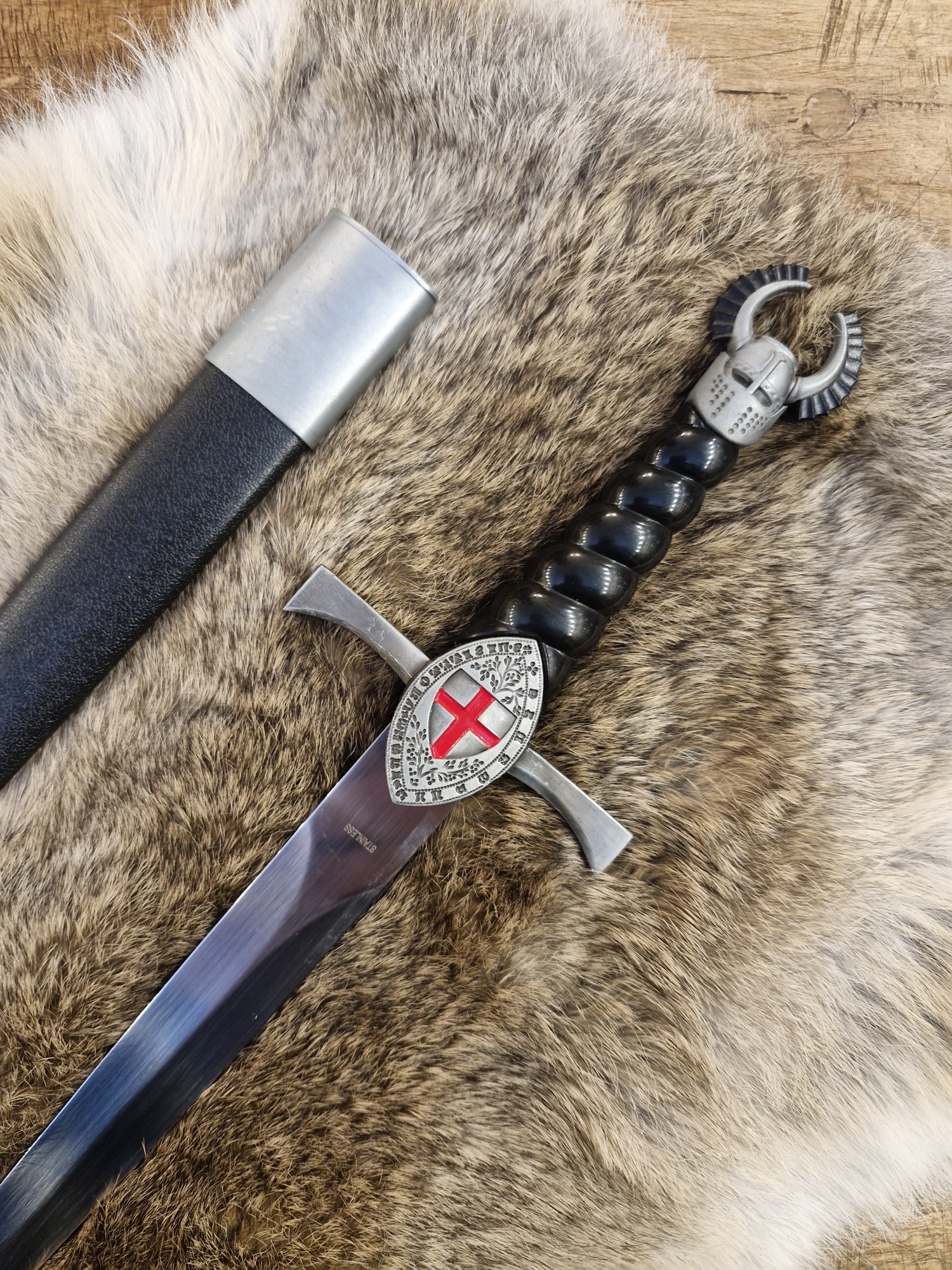 Dieser dekorative Deutschritter Dolch mit Kreuz und Helmknauf wurde aus rostfreien Stahl gefertigt und in silberfarbender Optik gehalten und besitzt eine passende Scheide. Der Knauf des Deutschritter Dolch zeigt einen hochdetailiert und auffälligen Helm des Deutschritterordenund auf dem Parier befindet sich das dazugehörige Petschaft und Wappen des Orden aus dem 14. Jahrhundert des Mittelalter mit roter Emaile. Der Deutschritter Dolch mit Kreuz und Helmknauf ist eine wunderbare Dekoration und Geschenk für Deutschritter, Mittelalter und Ritter Fans, aber auch als Brieföffner hervorragend geeignet.