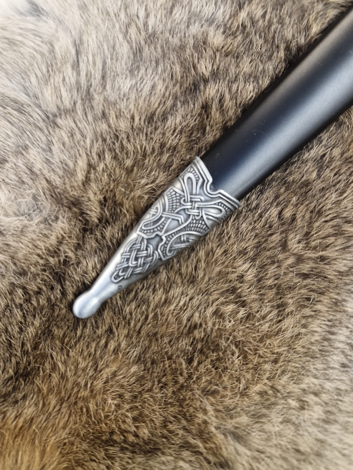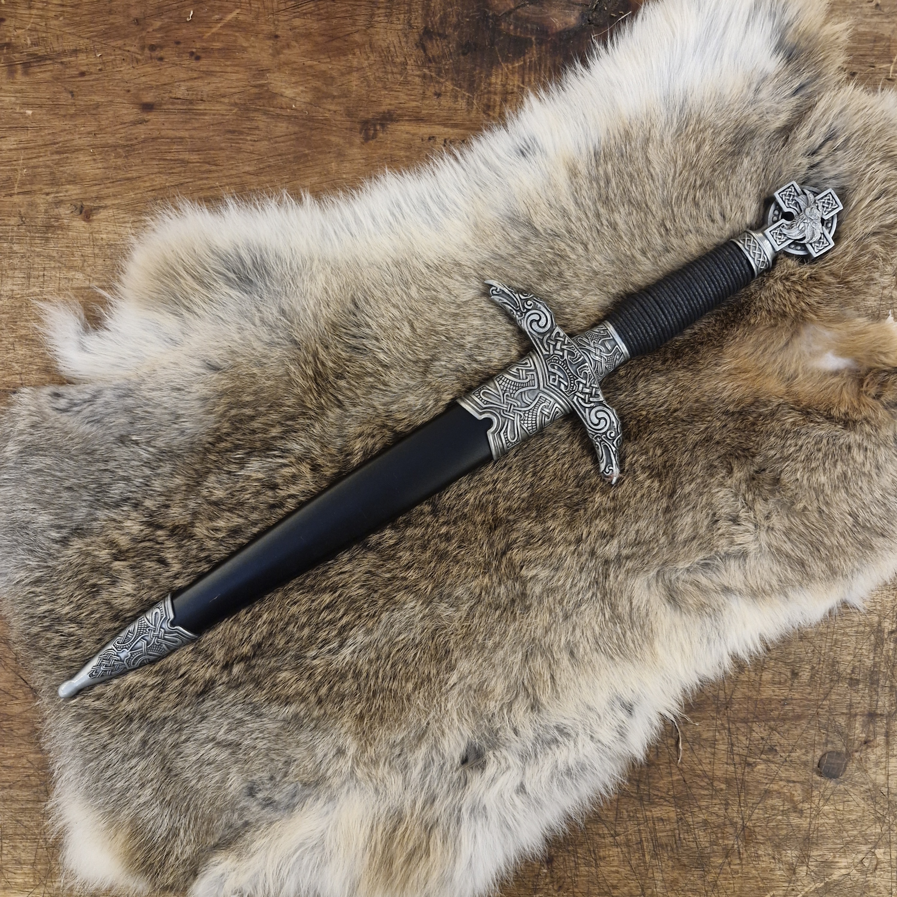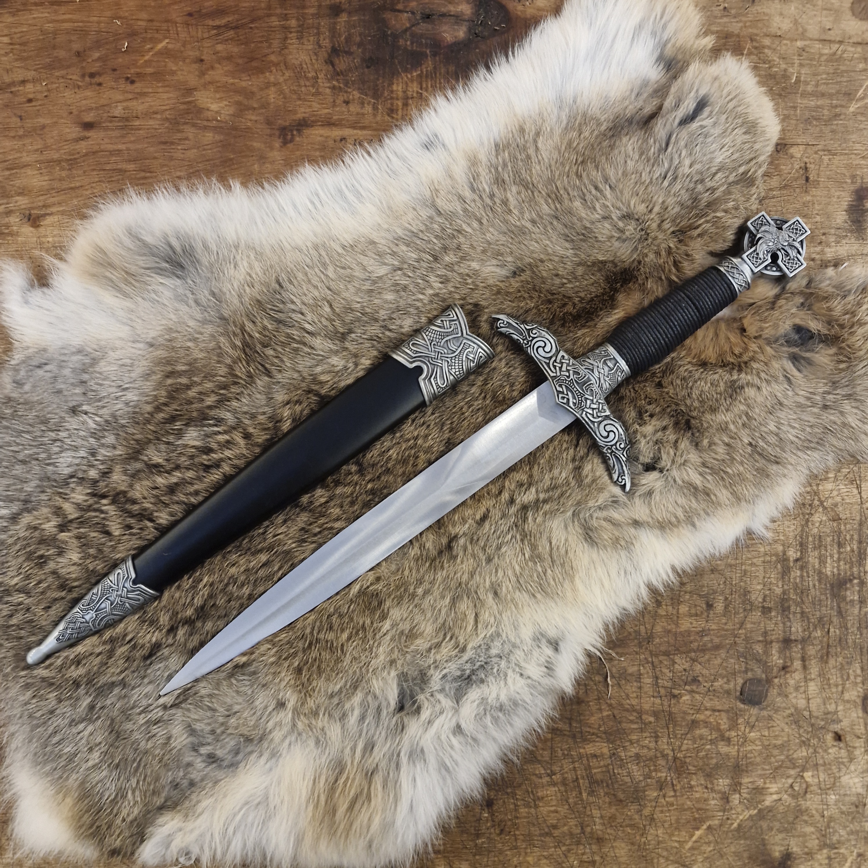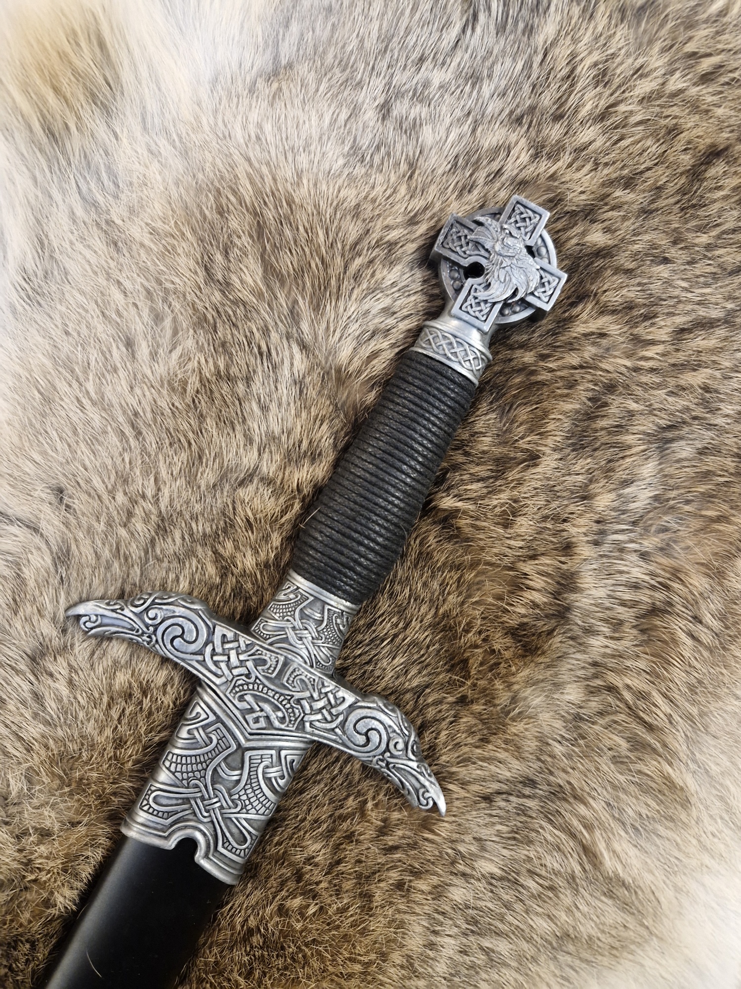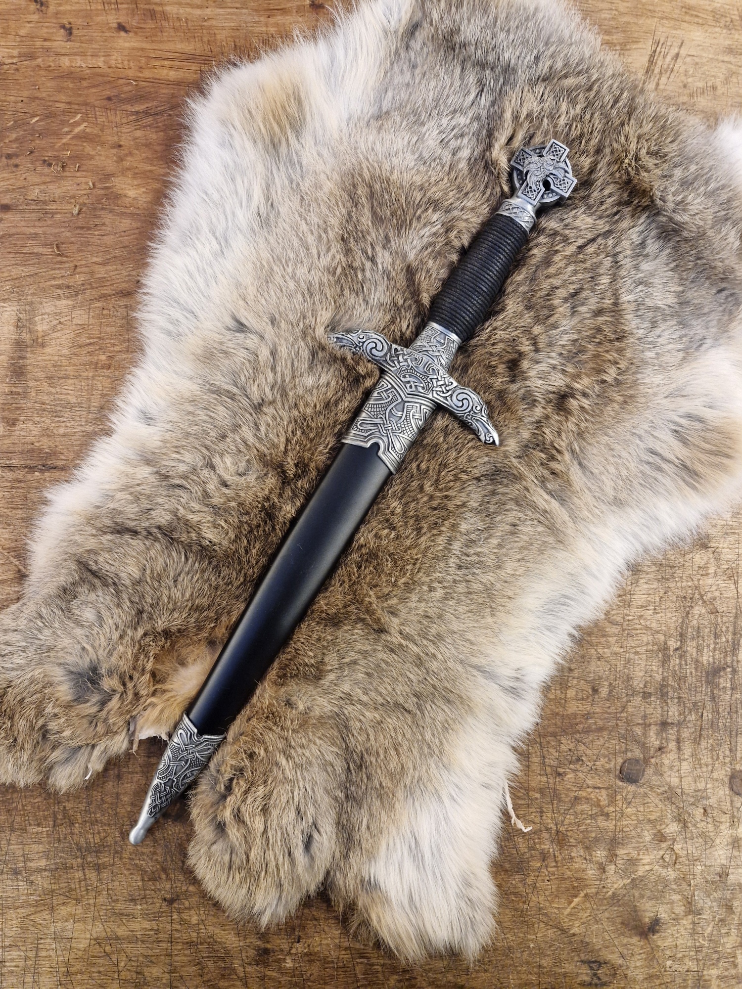 Der germanische Rabendolch des Wotan besitzt einen auffälligen Knauf der ein Keltenkreuz mit einem Raben zeigt, ebenso besteht der Parier aus zwei stilisierten Raben. Die Klinge wird in eine verzierten Scheide aus robusten Kunststoff gesteckt. Dieser Wotansdolch ist die perfekte Dekoration und auch Geschenk für Germanen und Wikinger Fans.